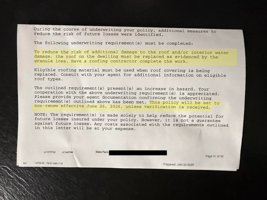“Your roof appears to be near the end of its useful life. Please provide proof of replacement to maintain coverage.”